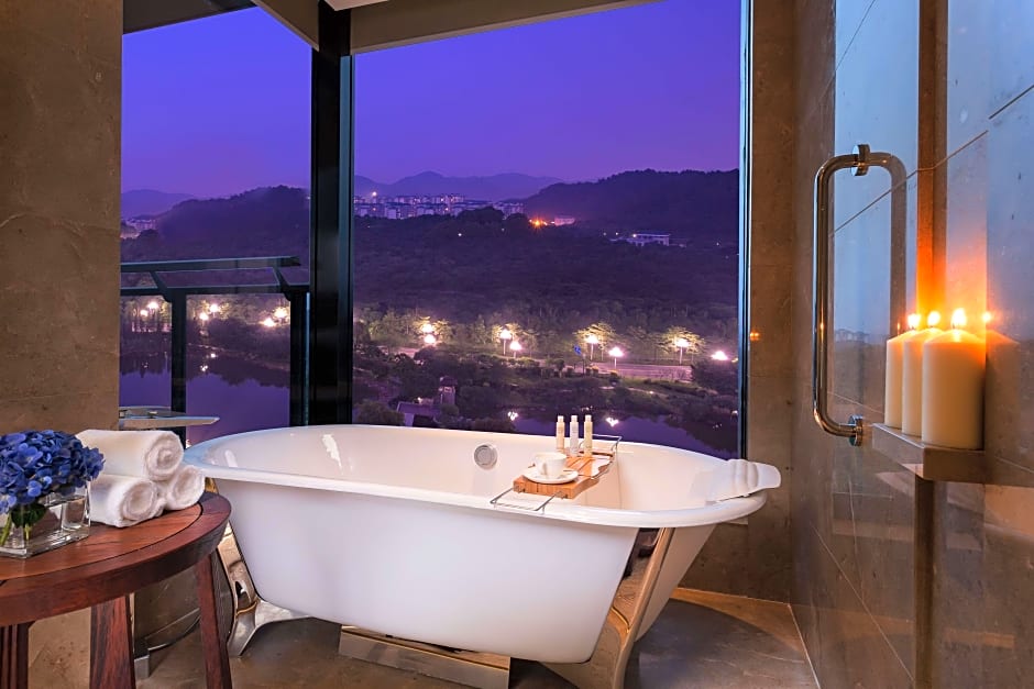 Features Lake Views, Executive Benefits, Balcony, Entertainment Area, Walk-in Closet, high quality bed linen. Marble bathroom with a lake view bath tub and a walk-in rain shower. Also features an in-room safe, iron/iron board and individual controlled air-conditioning.